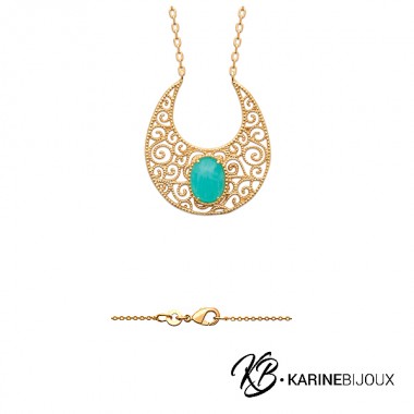 95,00 €Le collier Devika en plaqué or 18 carats se distingue par ses courbes délicates et ses arabesques en filigrane scintillant, ornées de petites boules qui ajoutent une touche de sophistication. Au centre, une véritable pierre amazonite ovale, montée sur griffes, confère une élégance naturelle à ce pendentif. Suspendu à une chaîne maille forçat ajustable entre 42 et 45 cm, ce collier sublime votre décolleté avec grâce et éclat.