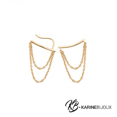 Chaque boucle se fixe au lobe avec une tige crochet sécurisée, assurant un port confortable tout au long de la journée. Les chaînettes remontent légèrement le long de l’oreille, créant un effet visuel raffiné et captivant, idéal pour sublimer vos tenues en toute occasion.
