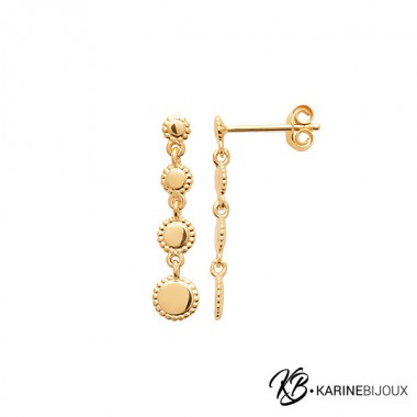 52,00 €Ces élégantes boucles d'oreilles en plaqué or 18 carats se distinguent par une chute gracieuse de quatre pastilles circulaires. Elles sont soulignées par un délicat serti perlé, créant un relief lumineux. La finition miroir du doré offre un éclat qui capte la lumière à chaque mouvement. Des boucles intemporelles au design épuré, parfaite pour sublimer votre visage avec une touche de modernité raffinée.