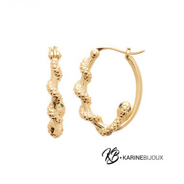 Un oxyde de zirconium vert étincelant, placé en guise d’œil, accentue le regard captivant du serpent, ajoutant une touche envoûtante à ces boucles. Cette fusion de design sophistiqué et de détails minutieux fait des boucles Kiara un choix parfait pour sublimer n’importe quelle tenue.