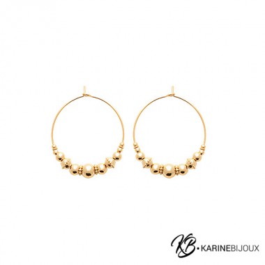 66,00 €Ces créoles misent sur une silhouette aérienne et un jeu de textures captivant. L'anneau fin s'orne en sa base d'une enfilade de boules dorées aux volumes variés et perlées créant un relief. La lumière danse sur ces sphères polies, dégageant une aura lumineuse et un éclat qui illumine le visage. Une création intemporelle à l'esprit bohème chic, idéale pour apporter une touche solaire et un mouvement délicat à votre visage.