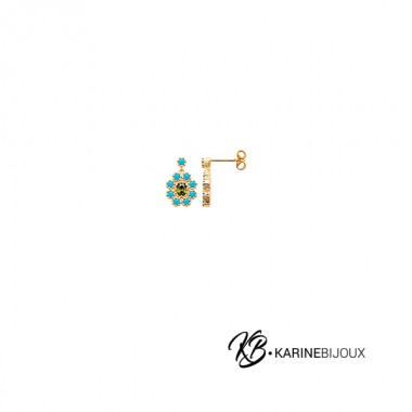 66,00 €Ces pendants d'oreilles en plaqué or 18 carats se distinguent par leur design floral et leur harmonie chromatique. Le motif suspendu est orné d'un cristal teinté vert olive au centre, entouré d'une corolle de pierres imitation turquoise pour un rendu lumineux et solaire. La chaleur du doré souligne délicatement l'éclat des couleurs, offrant un fini éclatant et original. Pièces intemporelles et audacieuses, elles apportent une touche de fraîcheur et d'élégance.