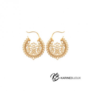 82,00 €Créoles Bohème Chic en Plaqué Or 18 Carats Ajoutez une touche de charme bohème et d'élégance intemporelle à votre collection de bijoux avec cette somptueuse paire de créoles. Fabriquées en plaqué or 18 carats, elles se distinguent par leur design délicat et raffiné, mettant en avant des motifs floraux et arabesques ajourés qui captivent le regard. La finition garantie une allure luxueuse.