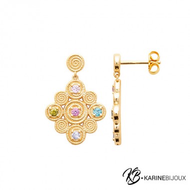92,00 €Ces pendants d'oreilles en plaqué or 18 carats se distinguent par un travail d'orfèvrerie remarquable, mêlant esprit bohème et raffinement. Leur structure en forme de losange est composée de spirales ciselées, créant un motif d'arabesques lumineux. Chaque boucle est parsemée de cristaux teintés aux nuances pastel, offrant un éclat printanier. Des boucles intemporelles et aériennes qui habillent le visage avec une élégance solaire, parfaite pour apporter une touche de poésie et de couleur.