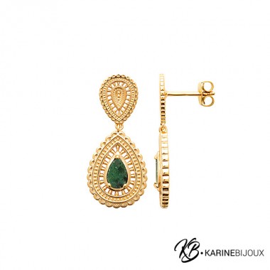 92,00 €Ces magnifiques boucles en plaqué or 18 carats se distinguent par leur travail de ciselure d'une finesse exceptionnelle. La structure ajourée, inspirée des motifs orientaux, offre un rendu lumineux et précieux. Au cœur de cette dentelle dorée se niche une pierre naturelle de jaspe dalmatien en forme de goutte, apportant un contraste éclatant. Des boucles majestueuses qui habillent le visage avec grâce, idéale pour sublimer vos tenues les plus sophistiquées.