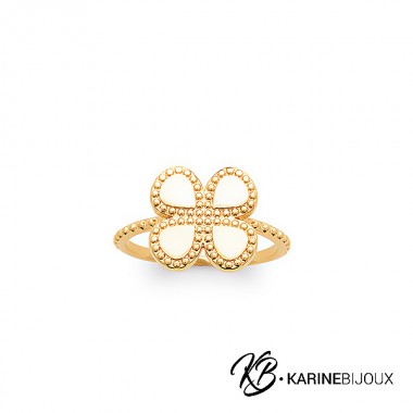 Ce modèle en forme de trèfle est orné de petites boules en plaqué or autour des quatre feuilles et de l'anneau, apportant une touche de raffinement et d'élégance.