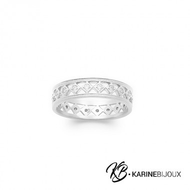 Cette bague finement travaillée est ornée d'oxydes de zirconium et alterne des maillons entre lisses et texturés.
