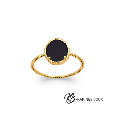 Au centre, une pierre onyx noire ovale, polie et lisse, est mise en valeur par un serti en plaqué or finement détaillé. Ce contraste entre l’onyx noir profond et l’éclat doré crée une pièce de bijouterie à la fois élégante et captivante.