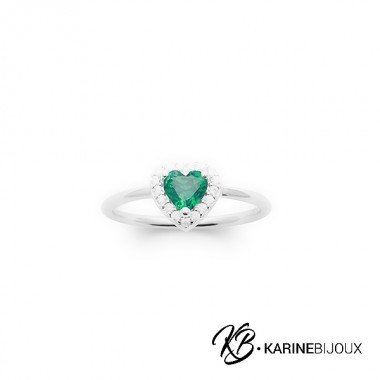 Elle est ornée d’une pierre verte éblouissante imitant l’émeraude, taillée en forme de cœur et entourée d’un halo scintillant de petits oxydes de zirconium.