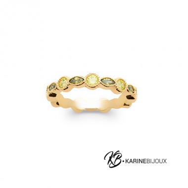 Orné de petites pierres d’oxydes de zirconium teintées vert, rappelant la beauté du péridot, cet anneau capte la lumière de manière envoûtante.