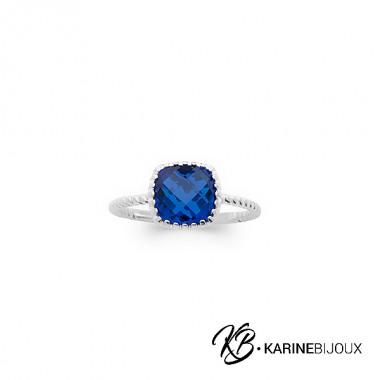 Elle est ornée d'une pierre teintée bleue, taillée en forme de coussin pour capturer la lumière et imiter l'éclat du saphir.