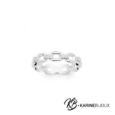 Cette bague finement travaillée est ornée d'oxydes de zirconium et alterne des maillons entre lisses et texturés.