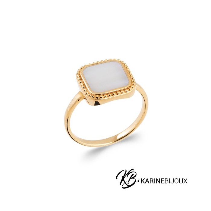 Cette bague chic en plaqué or 18 carats est ornée d'un pavé en véritable nacre aux multiples reflets, agrémentée de petites boules sur le contour.