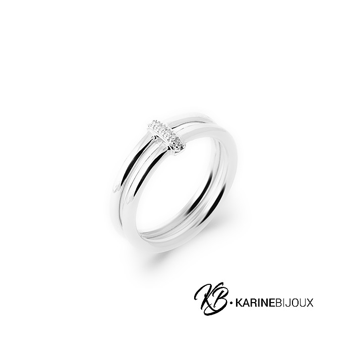 Découvrez cette élégante bague composée de deux anneaux lisses en argent 925/000 rhodié, reliés par un lien délicatement orné de petits oxydes de zirconium.