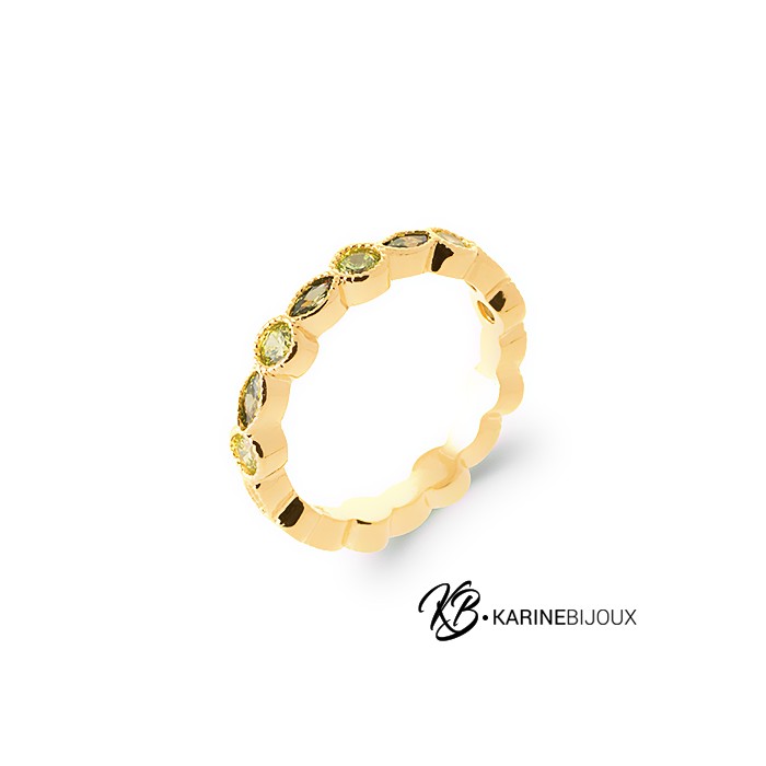 Orné de petites pierres d’oxydes de zirconium teintées vert, rappelant la beauté du péridot, cet anneau capte la lumière de manière envoûtante.