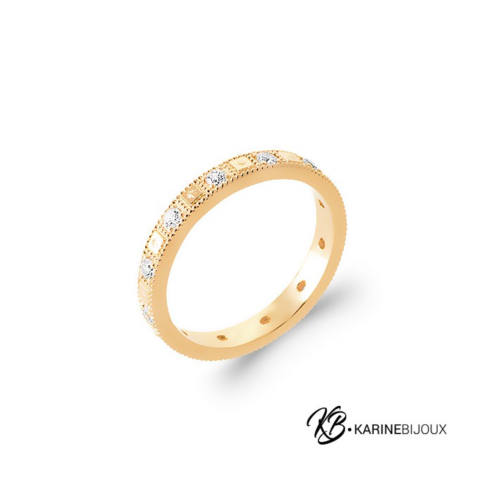 Un travail de texture remarquable composé de petits carrés avec des motifs étoilés, alternant finitions lisses et micro perlées pour un jeu de lumière constant.  Un pavage d'oxydes de zirconium étincelants vient couronner l'anneau, offrant une brillance irrésistible.