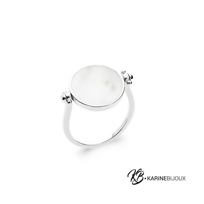l'élégance épurée de cette bague en argent rhodié met en lumière un rond de nacre véritable, sélectionné pour ses reflets irisés et ses nuances nacrées uniques. La nacre est délicatement suspendue entre deux attaches perlées, créant un design moderne. Le corps de bague bénéficie d'un traitement au rhodium, garantissant un éclat durable qui ne ternit pas au fil du temps. Une bague mélangeant la noblesse de l'argent à la douceur organique de l'océan.
