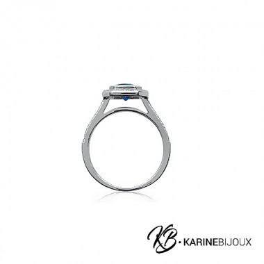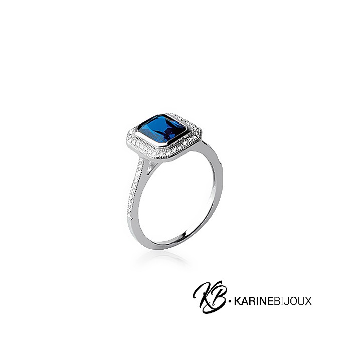 Son pavé teinté bleu saphir profond est entouré de petits oxydes de zirconium, ajoutant une touche de raffinement.