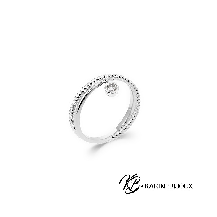 Découvrez ce modèle en argent 925 rhodié, composé d'un oxyde de zirconium monté en serti clos, raccordé à deux anneaux croisés dont l'un à l'effet de torsade.