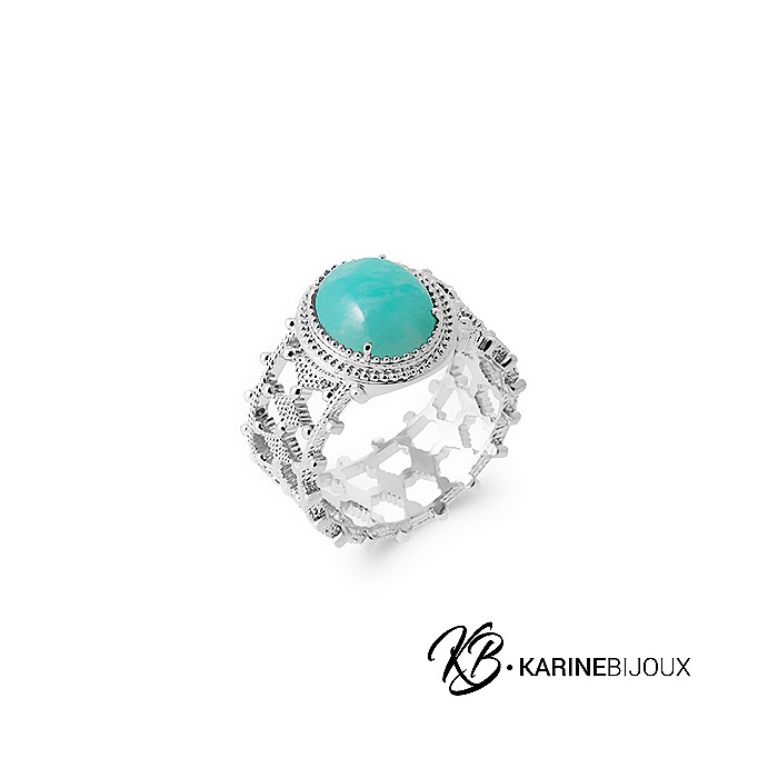 Des finitions parfaites pour cette magnifique bague en argent 925 rhodié, ornée de petites boules en argent qui encerclent une amazonite taillée en forme de cabochon.