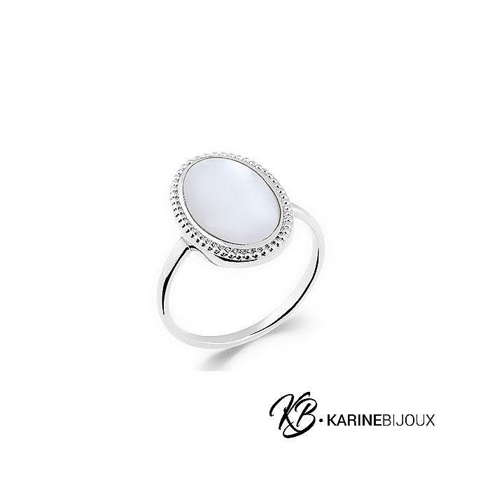 Adoptez un style chic et rétro avec cette bague ornée d'une jolie nacre ovale, encerclée par de petites boules en argent.