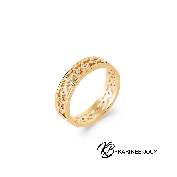 La bague Ainhoa est élégante et raffinée, présentant un anneau large incrusté d'oxydes de zirconium qui captent la lumière à chaque mouvement.