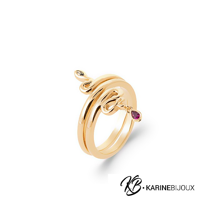 Magnifiquement conçue pour ressembler à un serpent élégant ajoutant une touche de mystère et de sophistication, la bague Soelya est ornée de deux oxydes teintés imitant le rubis suspendu en pampille et d'un zirconium teinté vert pour apporter de l'éclat à la beauté naturelle du design.