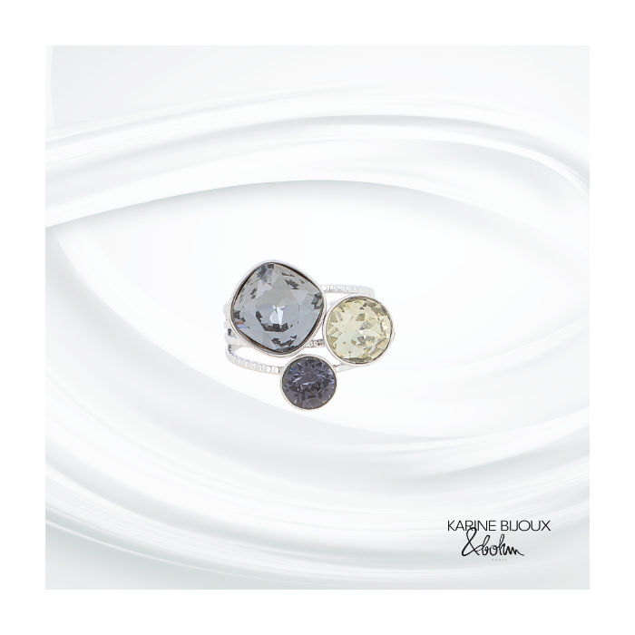 Sublimez votre style avec cette bague en acier inoxydable argentée by Bohm Paris, ornée de trois cristaux finement taillés aux dimensions harmonieuses (10 x 10 mm, 8 x 8 mm et 6 x 6 mm), elle est conçue pour capturer la lumière et apporter une touche d’éclat.
