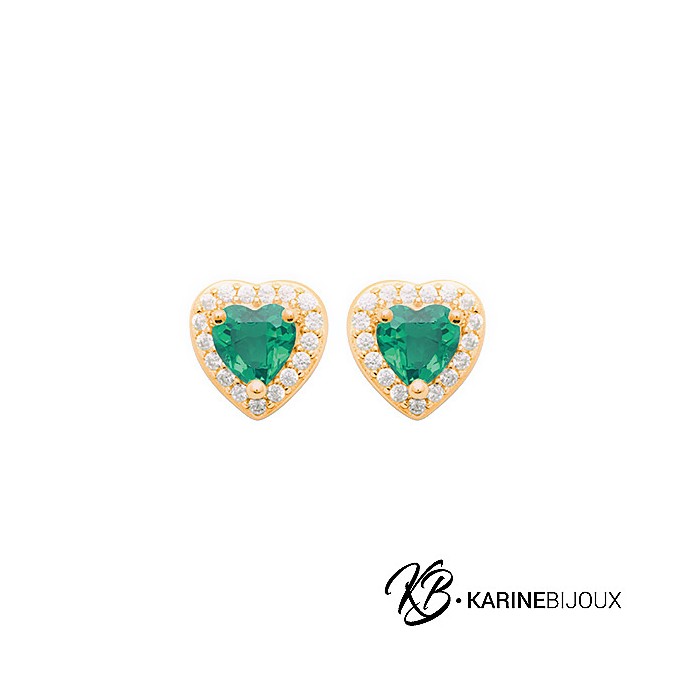 Les puces d'oreilles Lina en plaqué or 18 carats arborent un design en forme de cœur, rehaussé par un oxyde central d’un vert éclatant qui imite parfaitement l’émeraude. Autour de cette pierre centrale, un halo d'oxydes de zirconium ajoute une touche de brillance subtile, capturant et reflétant la lumière à chaque mouvement. Élégantes et intemporelles, ces boucles d’oreilles sont parfaites pour sublimer votre visage en toute occasion.