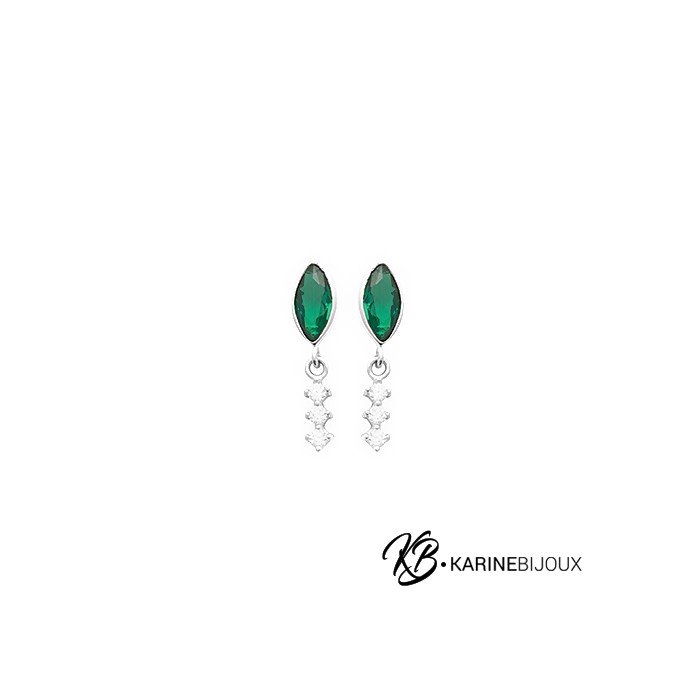 Sublimez votre style avec les boucles d'oreilles pendantes Della en argent rhodié, un bijou où l'élégance classique rencontre le design moderne. Chaque boucle est ornée d'un oxyde de zirconium teinté imitant l’émeraude, taillé en navette, qui capte et reflète la lumière pour un éclat intense. De délicats zirconiums scintillants entourent la pierre principale, ajoutant un jeu de lumière fascinant à chaque mouvement.