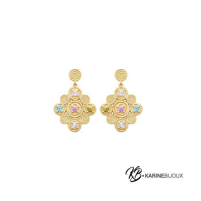 Ces pendants d'oreilles en plaqué or 18 carats se distinguent par un travail d'orfèvrerie remarquable, mêlant esprit bohème et raffinement. Leur structure en forme de losange est composée de spirales ciselées, créant un motif d'arabesques lumineux. Chaque boucle est parsemée de cristaux teintés aux nuances pastel, offrant un éclat printanier. Des boucles intemporelles et aériennes qui habillent le visage avec une élégance solaire, parfaite pour apporter une touche de poésie et de couleur.