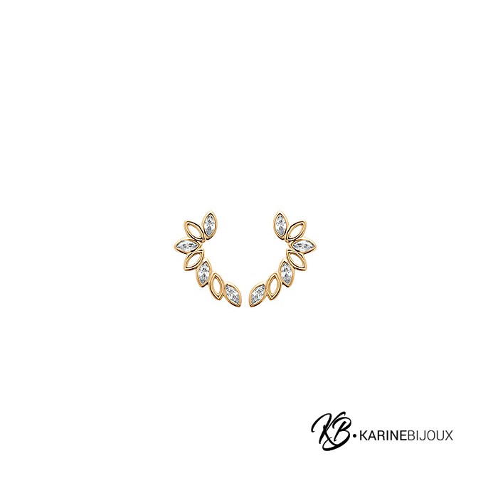 Ces boucles lobes d'oreilles montantes en plaqué or 18 carats se distinguent par leur design végétal d'une grande finesse. Elles épousent la courbe du lobe avec une succession de navettes alternant doré lisse et oxydes de zirconium taillés en marquise. Cet agencement crée un éclat lumineux. Une pièce intemporelle au fini éclatant, idéale pour habiller l'oreille avec une élégance moderne et un raffinement résolument féminin.