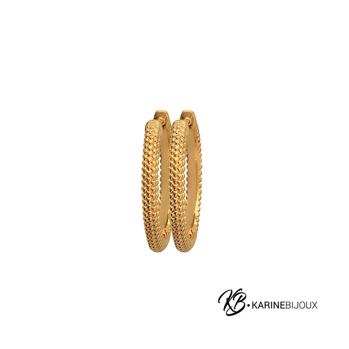 Ces superbes créoles en plaqué or 18 carats revisitent un grand classique avec une texture audacieuse et raffinée. Chaque anneau est entièrement recouvert de petites billes dorées, créant un relief lumineux. La finition polie offre un éclat qui sublime le visage à chaque mouvement. Pièce intemporelle et chic, ces boucles d'oreilles allient la force d'un design texturé à la douceur du doré pour une élégance moderne parfaite en toute occasion.