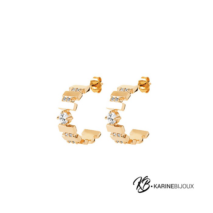 Ces boucles d'oreilles affichent un style graphique affirmé grâce à leur structure composée de petits lingots juxtaposés. Conçues en plaqué or 18 carats, elles présentent une alternance rythmée. Un oxyde de zirconium central, plus imposant, diffuse une clarté lumineuse au cœur, tandis que de petits cristaux ajoutent un fini éclatant, parfaite pour structurer votre style avec une élégance résolument moderne.
