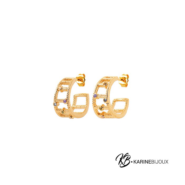 Un souffle de modernité parcourt ce design ajouré où de fines lignes dorées s'entrelacent avec élégance. Confectionnée en plaqué or 18 carats, ces boucles d'oreilles se parent d'une pluie de cristaux multicolores qui captent chaque rayon pour un rendu lumineux. L'alternance des teintes apporte une profondeur éclatante. Une création intemporelle qui marie avec brio l'audace géométrique et la douceur des reflets chromatiques.