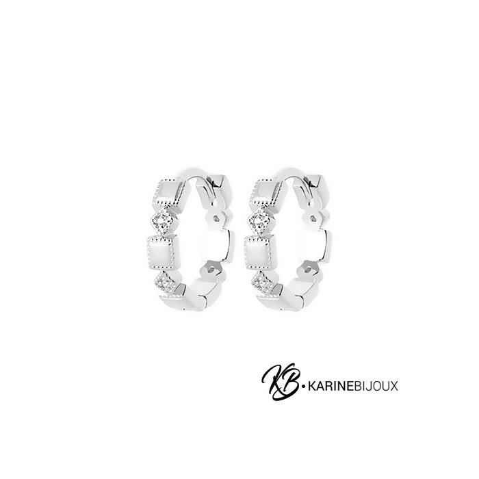 Ces créoles en argent rhodié se distinguent par une alternance de motifs carrés et de losanges scintillants, créant un jeu de relief. Chaque losange est serti d'un oxyde de zirconium apportant une lueur délicate. Le fini argenté offre des reflets miroirs qui subliment ce design géométrique.