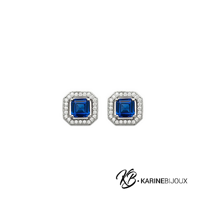 Ces clous d'oreilles carrés en argent rhodié sont ornés d’éblouissants oxydes bleus imitant le saphir, encerclés de petits zirconiums pour encore plus d’éclat. Élégantes et raffinées, elles subliment vos tenues avec style.