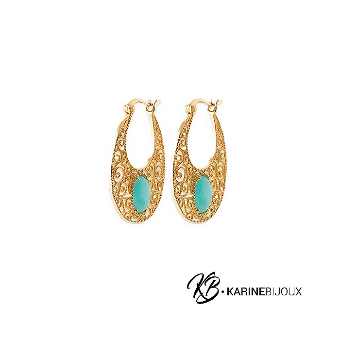 Les boucles pendantes Aylin en plaqué or 18 carats revisitent le motif d’arabesque, symbole de raffinement dans l'art décoratif, en l’associant à une véritable pierre amazonite. La pierre centrale, encerclée de petites boules dorées, ajoute une touche de couleur et de douceur, contrastant élégamment avec les motifs ajourés. Cette paire de boucles est parfaite pour apporter une note d’élégance artistique et naturelle à votre style, de jour comme de nuit.