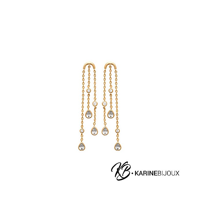Les boucles d'oreilles Héliona en plaqué or 18 carats sont conçues pour offrir une touche de sophistication et d'élégance à votre look. Chaque boucle est composée de trois chaînettes délicates, ornées de scintillants oxydes de zirconium montés en serti clos, capturant et reflétant la lumière pour un effet aéré et lumineux. Ce modèle raffiné est idéal pour sublimer votre visage et rehausser une tenue, que ce soit pour le quotidien ou des occasions spéciales.