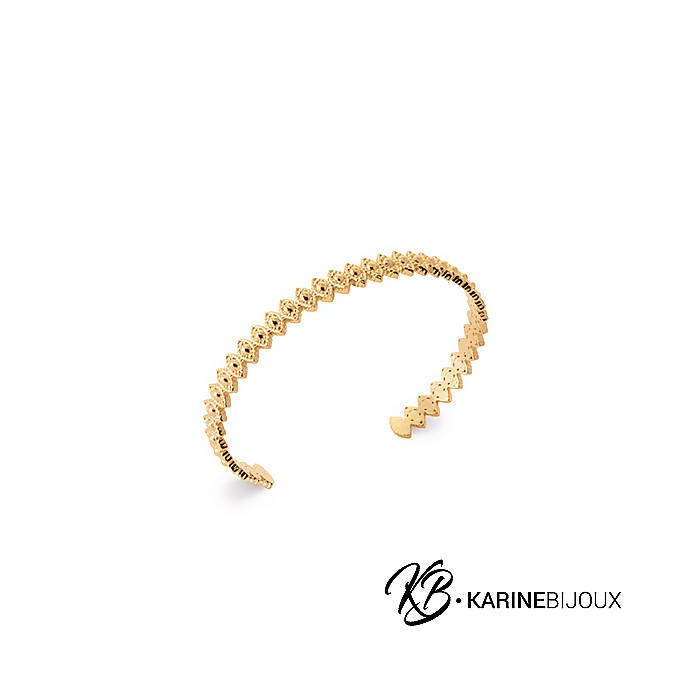 Ce bracelet rigide ouvert en plaqué or 18 carats est un véritable bijou de distinction. Il est orné d’un joli motif et de petites boules délicates, ajoutant une touche de charme unique. La finition dorée éclatante du bracelet lui confère une luminosité somptueuse, parfaite pour rehausser n’importe quelle tenue. Ce jonc est idéal pour les amatrices de bijoux distingués, offrant à la fois style et confort. Un ajout incontournable à toute collection de bijoux.