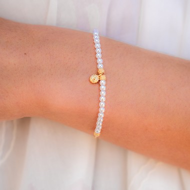 Apportez une touche d'élégance classique à votre style avec le bracelet Ina en plaqué or 18 carats, orné de perles d’imitation blanches et d'une pampille raffinée.