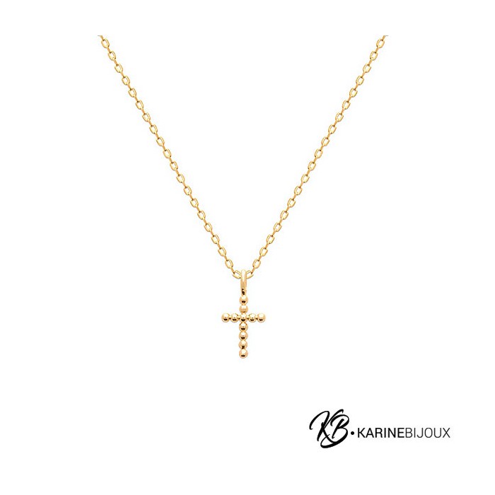 Le collier Ella en plaqué or 18 carats est un bijou élégant, mettant en valeur une croix finement travaillée. Ornée de petites boules en relief, cette croix capture la lumière et crée un effet visuel captivant. La chaîne maille forçat, réputée pour sa solidité et son allure raffinée, ajoute une touche classique et sophistiquée à ce bijou intemporel.