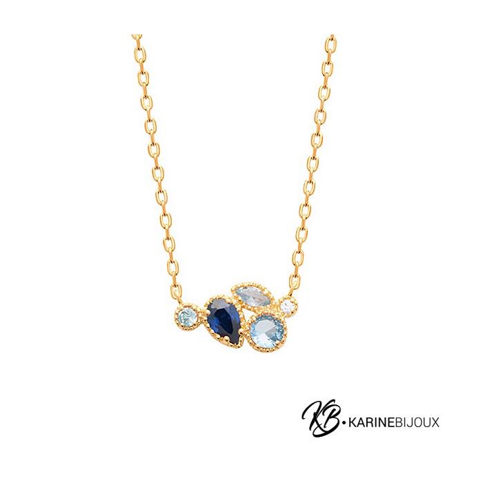 Le collier Emy en plaqué or 18 carats est un bijou captivant et élégant. Orné de deux petits oxydes montés en serti clos et de pierres bleues dégradées, il imite magnifiquement le saphir, avec des teintes allant du bleu profond au bleu clair. Ces pierres soigneusement sélectionnées évoquent la beauté des océans, apportant fraîcheur et éclat à votre look.
