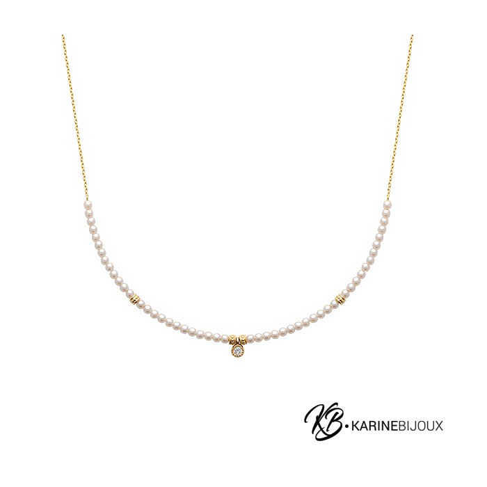 Le collier Méliana en plaqué or 18 carats incarne l'élégance intemporelle avec une touche moderne. Orné de fines perles imitant les perles de culture, il apporte une douceur et une luminosité naturelles à votre look. Au centre du collier, un scintillant oxyde de zirconium capte la lumière, rivalisant avec l'éclat du diamant et ajoutant une touche de sophistication.