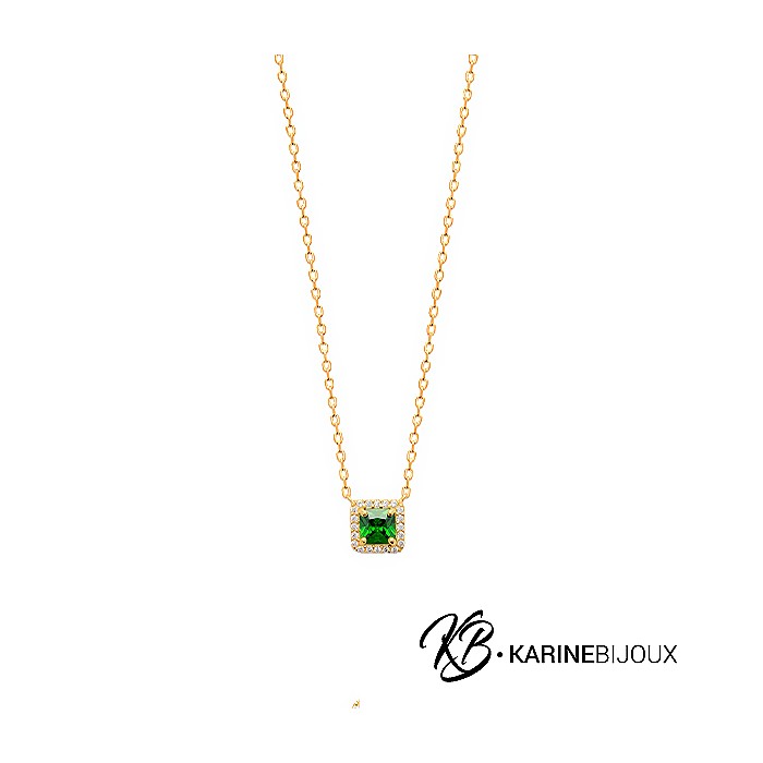 Le collier Cheina en plaqué or 18 carats est un bijou qui allie raffinement et élégance, avec son pavé carré en oxyde vert aux reflets émeraude. Ce pendentif est entouré de petits zirconiums scintillants, rappelant l’éclat des diamants, pour apporter une touche de joaillerie à votre tenue. Suspendu à une chaîne maille forçat réglable entre 42 et 45 cm, ce collier s'ajuste selon vos préférences et occasions.