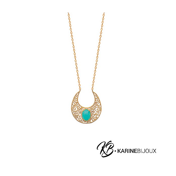 Le collier Devika en plaqué or 18 carats se distingue par ses courbes délicates et ses arabesques en filigrane scintillant, ornées de petites boules qui ajoutent une touche de sophistication. Au centre, une véritable pierre amazonite ovale, montée sur griffes, confère une élégance naturelle à ce pendentif. Suspendu à une chaîne maille forçat ajustable entre 42 et 45 cm, ce collier sublime votre décolleté avec grâce et éclat.