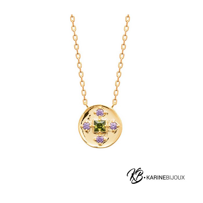 Le collier Youna en plaqué or 18 carats est un bijou captivant, orné d’un pendentif rond mettant en valeur une pierre verte centrale entourée de petites pierres violettes. Ce mélange harmonieux de couleurs apporte une touche de vivacité et d'élégance, parfait pour rehausser n'importe quelle tenue avec un éclat subtil.