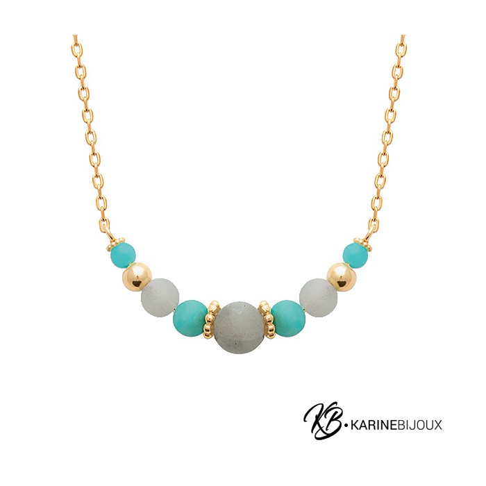 Le collier Maena en plaqué or 18 carats allie élégance et raffinement avec ses perles en labradorite grise et turquoise, rehaussées de petites boules en plaqué or. Ce bijou subtil et délicat, agrémenté d'une chaîne maille forçat, ajoute une touche sophistiquée à n’importe quelle tenue. La combinaison des différentes teintes de labradorite apporte un éclat mystique et unique à votre style.