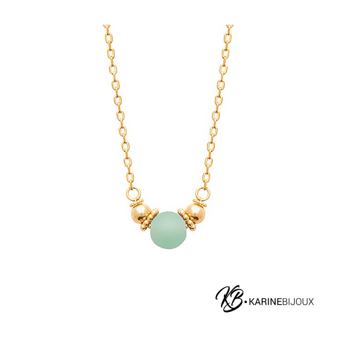 Le collier Alya en plaqué or 18 carats est une pièce délicate et élégante, mettant en valeur une perle en labradorite verte d'eau. Cette pierre précieuse est entourée de petites boules en plaqué or, ajoutant une touche de raffinement à ce bijou. La nuance douce et neutre de la labradorite verte se marie parfaitement avec l'éclat du plaqué or, créant une harmonie subtile et élégante.