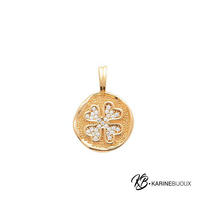 Le pendentif Sophie en plaqué or 18 carats met en valeur un trèfle à quatre feuilles, symbole universel de chance et de bonheur. Chaque feuille est incrustée d'oxydes de zirconium scintillants qui captent la lumière sous tous les angles, offrant un éclat exceptionnel. Le trèfle est enchâssé dans un médaillon rond en plaqué or, avec une surface irrégulière et texturée qui reflète la lumière pour un effet encore plus lumineux.